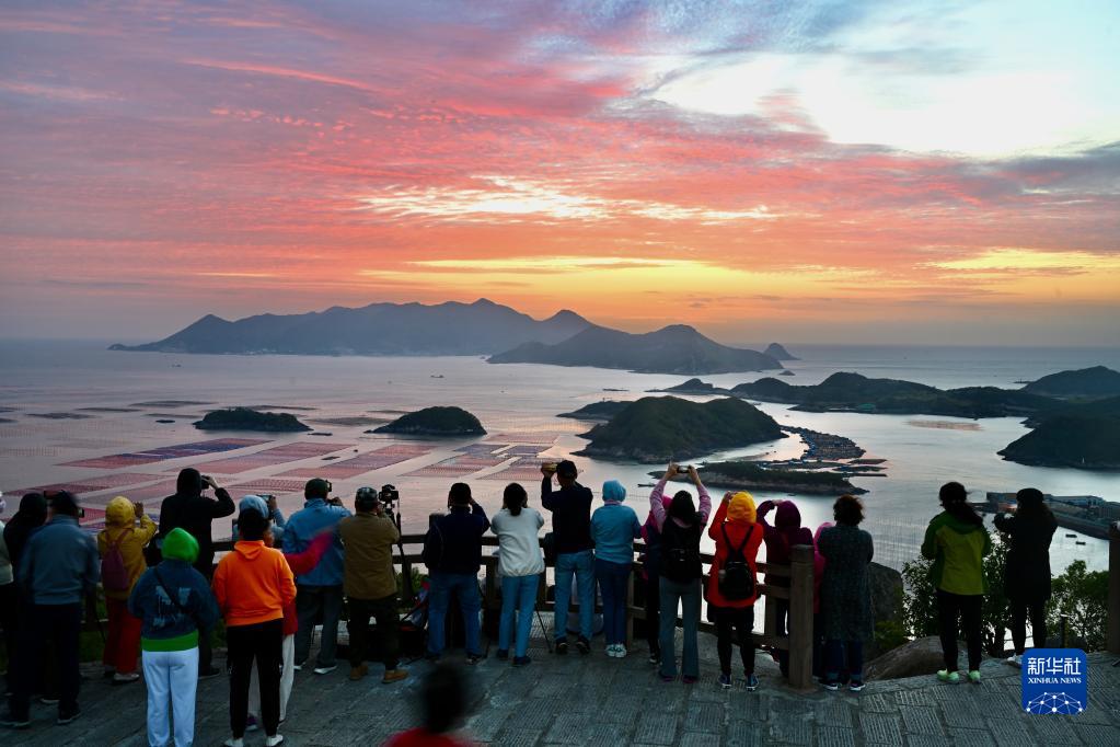 福建寧德霞浦縣三沙鎮花竹村海邊,游客在拍攝日出(2022年10月26日攝)。新華社記者 姜克紅 攝