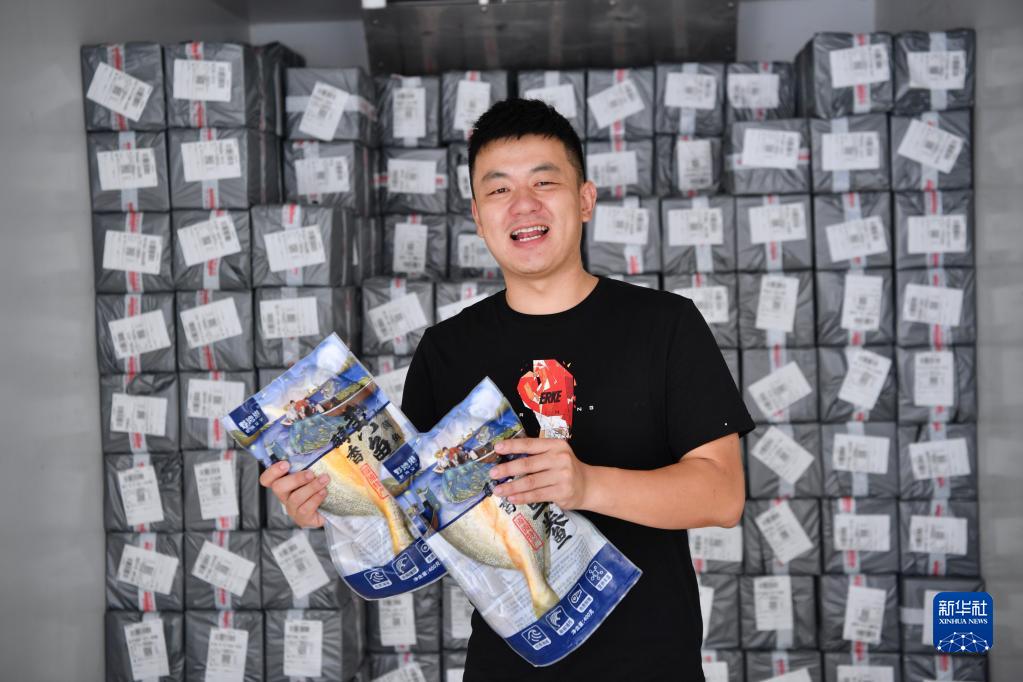 在福建寧德霞浦縣沙江鎮沙江村,張序劍在快遞車內介紹他銷售的大黃魚產品(2021年8月14日攝)。新華社記者 姜克紅 攝