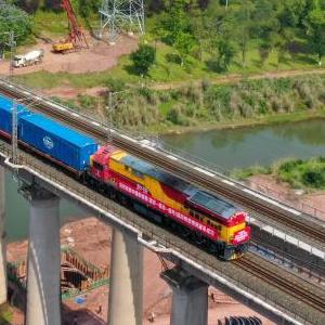 中緬新通道(重慶—臨滄—緬甸)國際鐵路班列從重慶果園港魚嘴車站順利發車(5月23日攝,無人機照片)。新華社記者 唐奕 攝