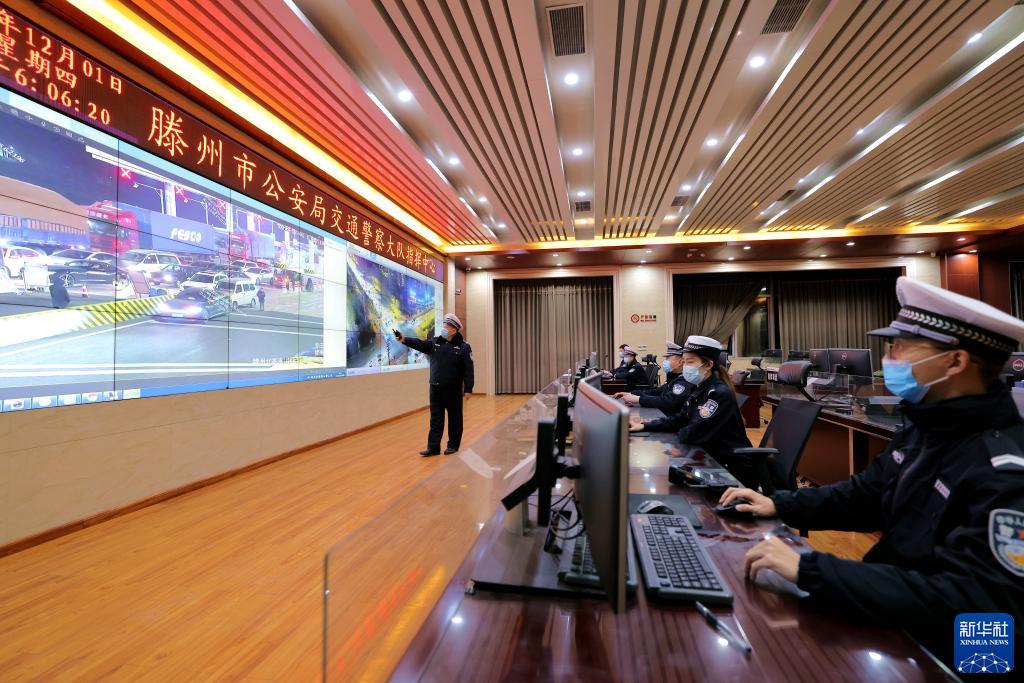 12月1日,在山東省滕州市公安局交警大隊指揮中心,借助“情、指、勤、督”一體化智慧交通管理平臺,民警對各個路口及路段交通流數據進行綜合分析。新華社發(鐘自增 攝)