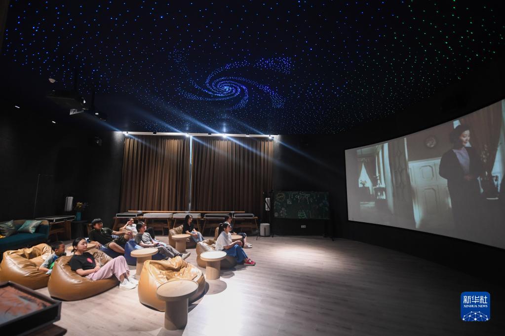 2022年7月2日,居民在位于浙江省杭州市富陽區銀湖街道硅谷社區的“合之舍”書房的影視廳內觀看電影。該書房是銀湖街道“15分鐘品質文化生活圈”的重要示范點位。新華社記者 徐昱 攝