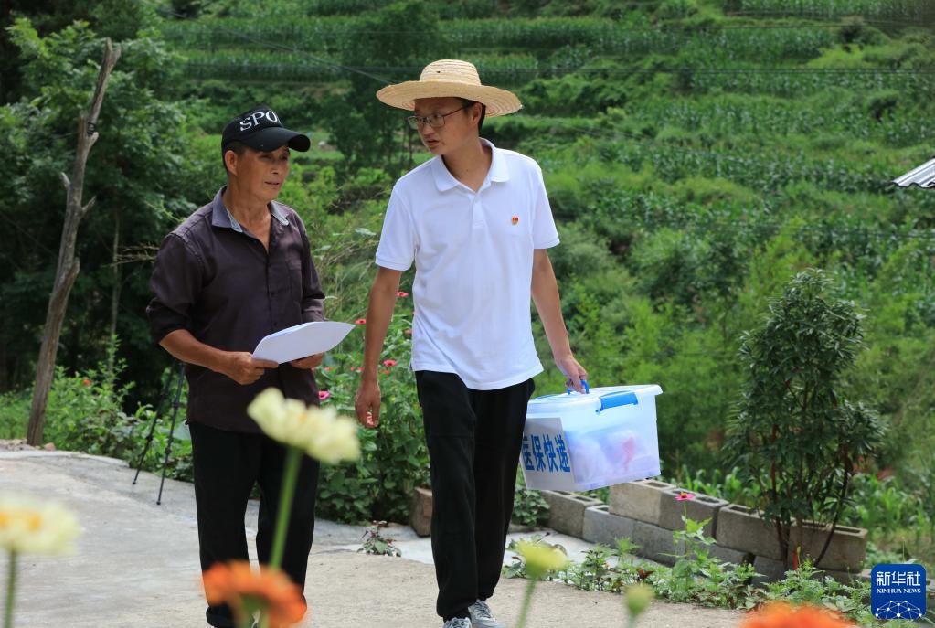 2022年7月5日,湖南省張家界市武陵源區天子山街道黃河村的“醫??爝f員”(右)在了解群眾訴求。新華社發(吳勇兵 攝)