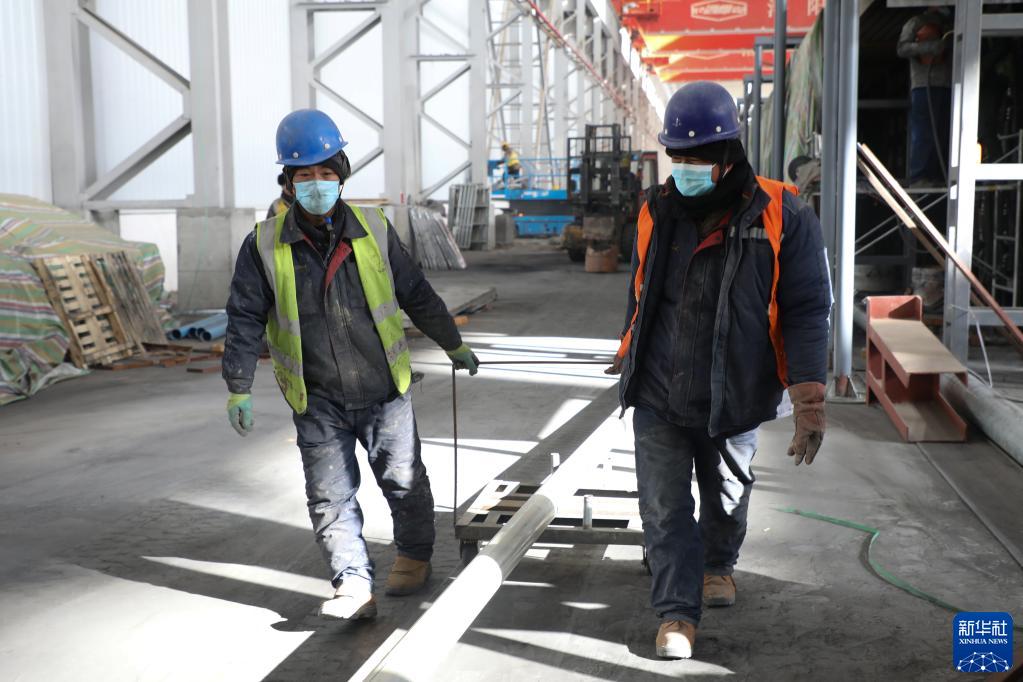 2022年12月12日,在位于蘭州新區的蘭州宏彬新能源發展有限公司,工人在搬運建材,抓緊施工。新華社記者 馬希平 攝