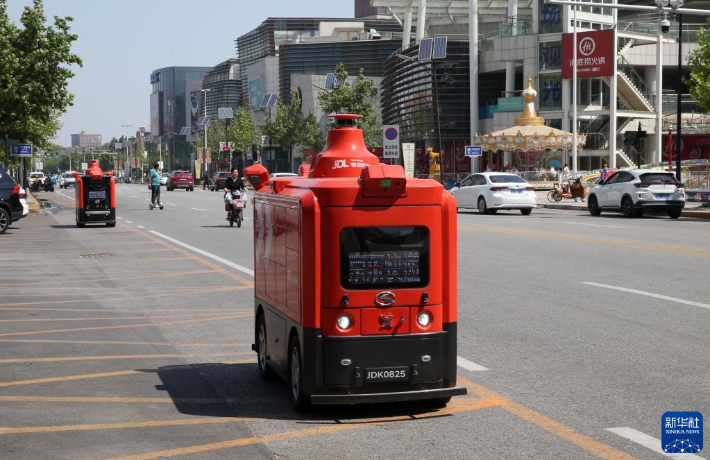 2021年5月18日,一輛自動行駛快遞車在天津(西青)國家級車聯網先導區內運送貨物。新華社發