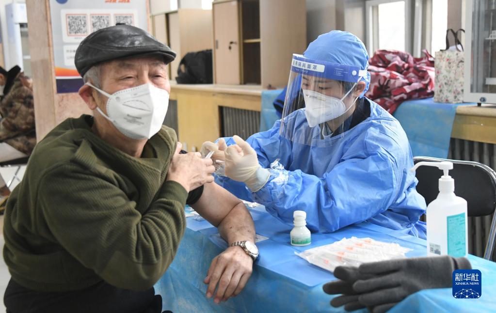 12月15日,在北京市海淀區中關村街道新冠疫苗接種點,醫護人員為老年人接種新冠疫苗。新華社記者 任超 攝