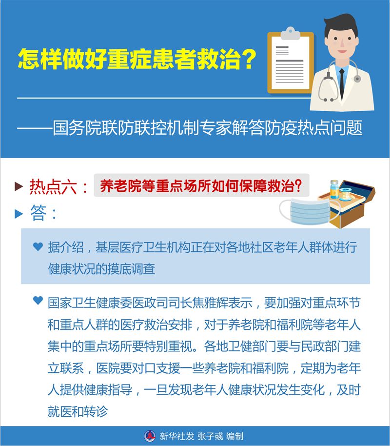 焦雅輝表示,要加強對重點環節和重點人群的醫療救治安排,對于養老院和福利院等老年人集中的重點場所要特別重視。各地衛健部門要與民政部門建立聯系,醫院要對口支援一些養老院和福利院,定期為老年人提供健康指導,一旦發現老年人健康狀況發生變化,及時就醫和轉診。