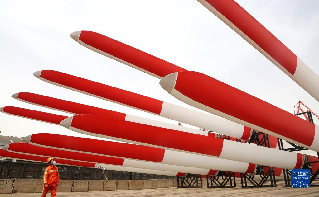 風力發電機葉片在江蘇連云港港碼頭等待裝船外運(2021年4月16日攝)。新華社發(王春 攝)