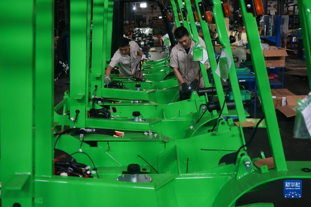在位于江蘇靖江的江蘇中力叉車有限公司,工人在生產“油改電”叉車(2021年6月12日攝)。新華社記者 季春鵬 攝