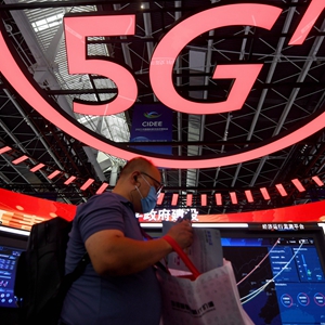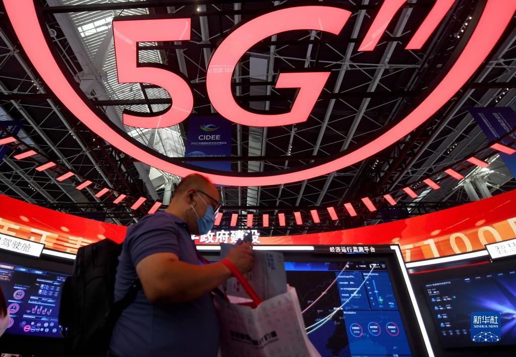 在河北省石家莊市舉行的2021中國國際數字經濟博覽會上,參觀者走過5G智慧展區(2021年9月6日攝)。新華社記者 王曉 攝