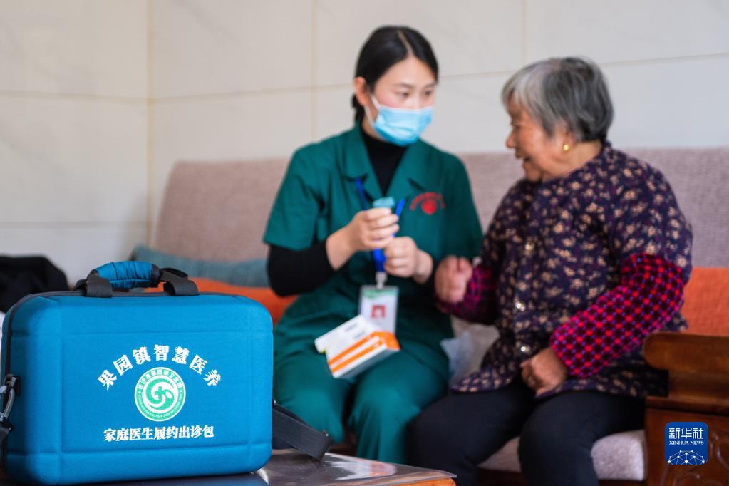 在湖南省長沙市長沙縣果園鎮楊泗廟社區,醫務人員指導居家老人用藥(2021年11月12日攝)。新華社記者 陳思汗 攝