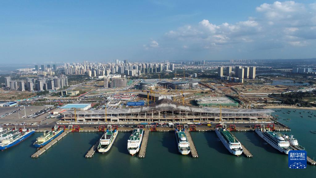 這是2022年2月11日拍攝的??谛潞8劭瓦\綜合樞紐項目施工現場(無人機照片)。新華社發(黎多江 攝)
