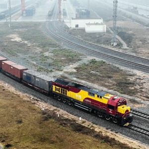 2022年1月15日,廣西新年首趟西部陸海新通道年貨班列從欽州港東站駛出(無人機照片)。新華社記者 張愛林 攝