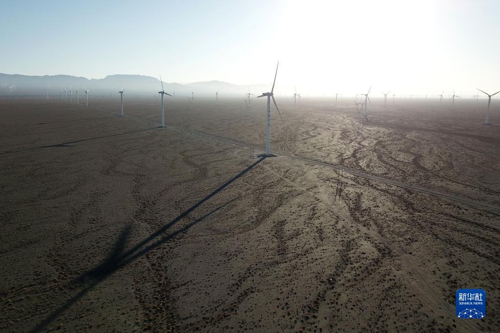 這是2021年12月8日拍攝的中節能(甘肅)風力發電有限公司玉門昌馬風電場的風機(無人機照片)。新華社記者 范培珅 攝
