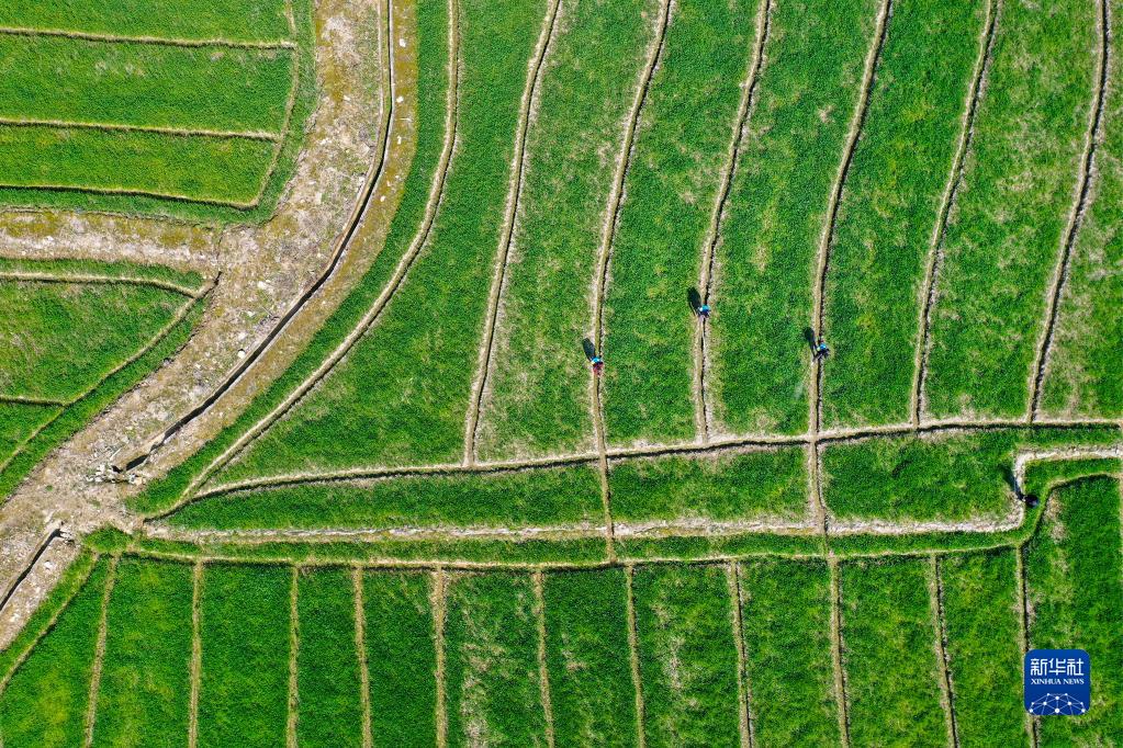 3月9日,浙江省寧波市鄞州區東吳鎮天童村村民在田間管護農作物(無人機照片)。新華社發(胡學軍 攝)