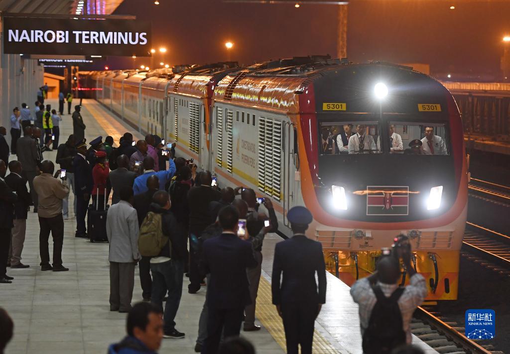 這是在肯尼亞首都內羅畢,首班從蒙巴薩發出的列車到達蒙內鐵路內羅畢南站(2017年5月31日攝)。由中國企業承建的蒙內鐵路當日建成通車。五年來蒙內鐵路累計發送旅客778.5萬人次,單日旅客最高發送量突破10000人。新華社記者 陳誠 攝