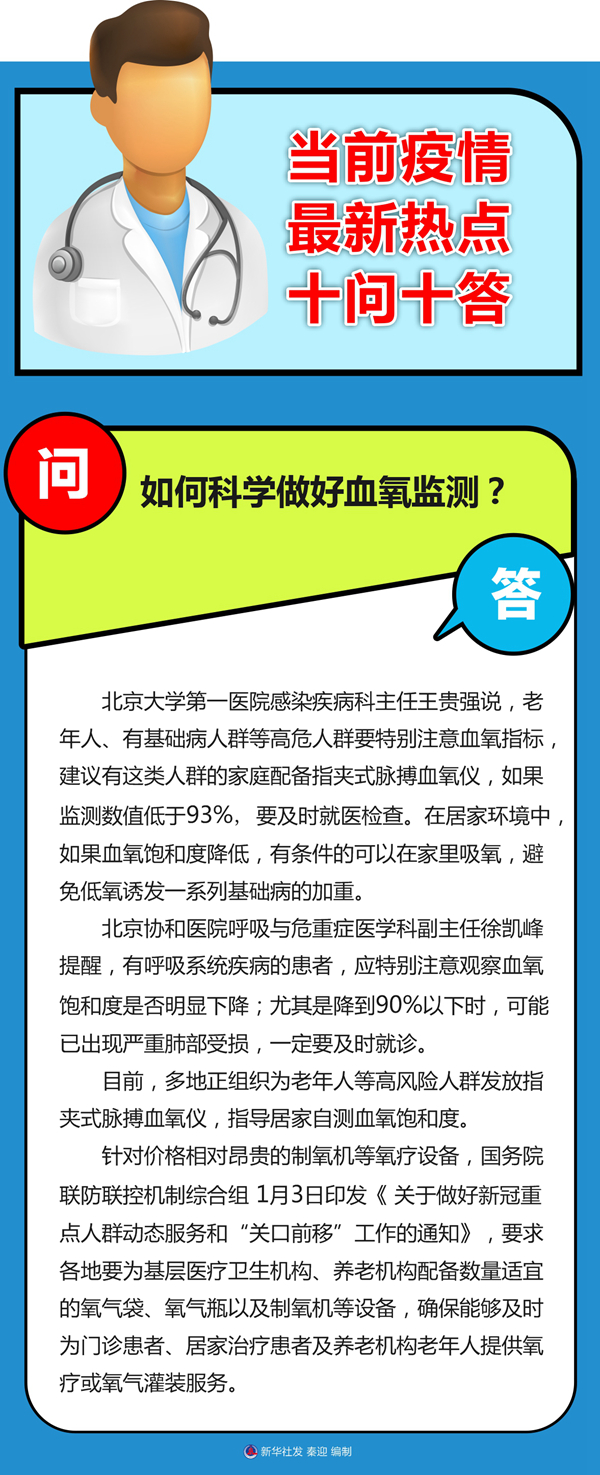 王貴強說,老年人、有基礎病人群等高危人群要特別注意血氧指標,建議有這類人群的家庭配備指夾式脈搏血氧儀,如果監測數值低于93%,要及時就醫檢查。在居家環境中,如果血氧飽和度降低,有條件的可以在家里吸氧,避免低氧誘發一系列基礎病的加重。