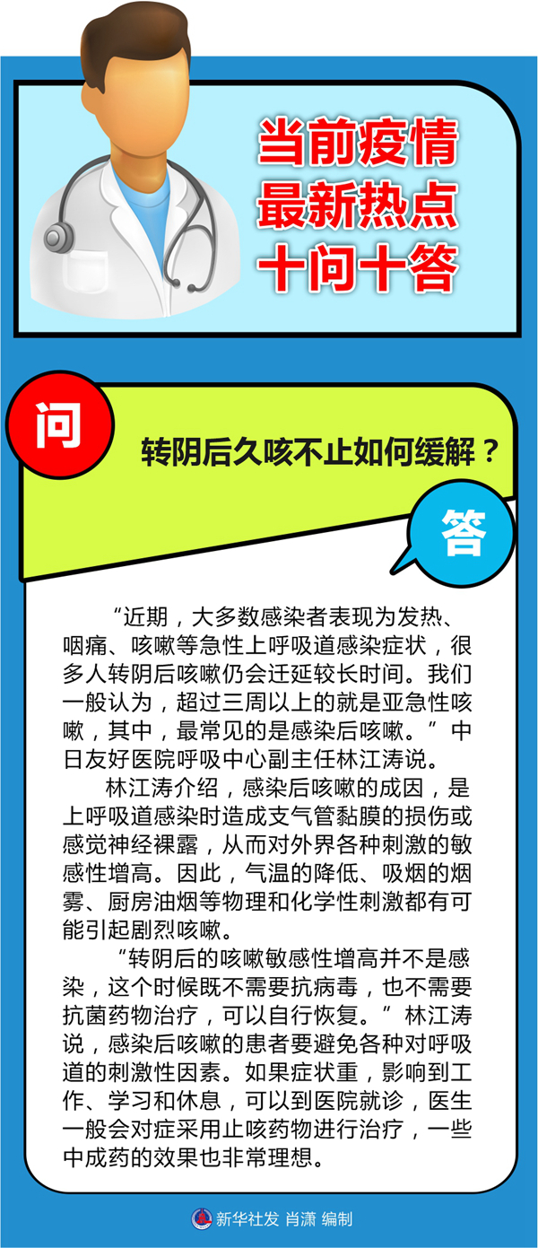 “近期,大多數感染者表現為發熱、咽痛、咳嗽等急性上呼吸道感染癥狀,很多人轉陰后咳嗽仍會遷延較長時間。我們一般認為,超過三周以上的就是亞急性咳嗽,其中,最常見的是感染后咳嗽?!敝腥沼押冕t院呼吸中心副主任林江濤說。