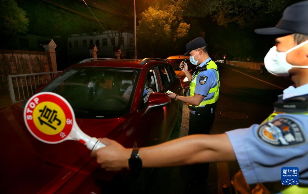 上海市公安局閔行分局梅隴派出所民警在夏夜治安巡查宣防集中統一行動中檢查司機證件(2022年7月23日攝)。新華社記者 凡軍 攝