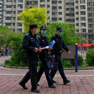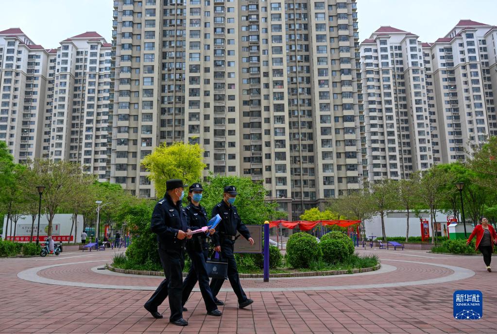 天津市公安局津南分局中鐵派出所的社區民警呂詩情(中)與民警王洪心(左)、輔警李兆輝在林景家園內巡邏(2022年4月28日攝)。新華社記者 孫凡越 攝
