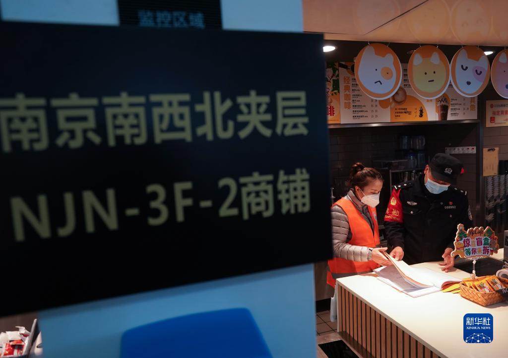 南京鐵路公安處南京南站派出所民警和志愿者一起在南京南站一家商戶檢查防火巡查記錄(2021年11月25日攝)。新華社記者 季春鵬 攝