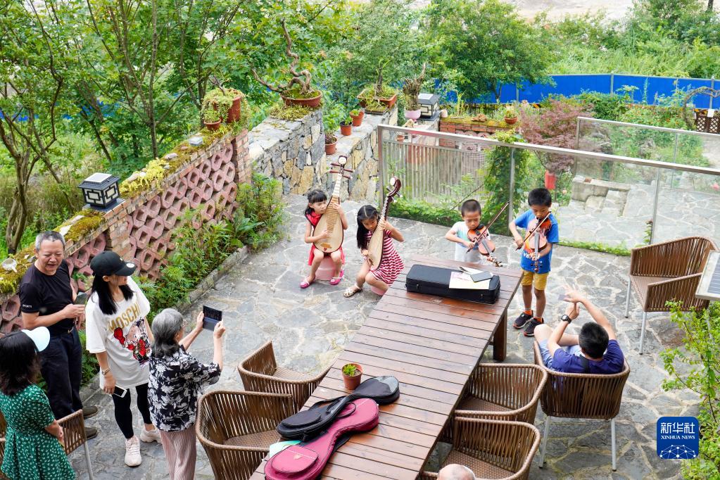 2020年7月30日,在重慶市武隆區仙女山街道荊竹村一家民宿內,游客在小院里休閑娛樂。新華社記者 劉潺 攝