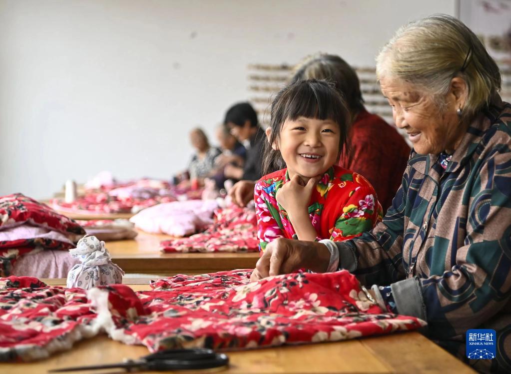 在山東沂水縣吳家樓子村,一名老人在教重孫女沂蒙小棉襖的縫制手藝(資料照片)。新華社發 (王文劍 攝)