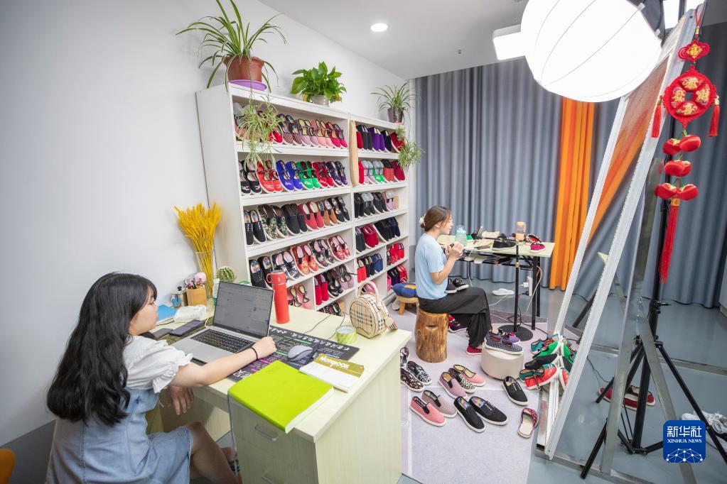 2022年8月20日,在重慶市巫溪縣文峰鎮農民工返鄉創業園,重慶何航鞋業有限公司的主播們在向直播間粉絲們推介各色布鞋。新華社記者 黃偉 攝