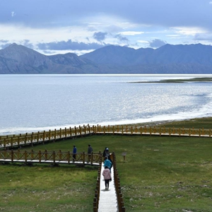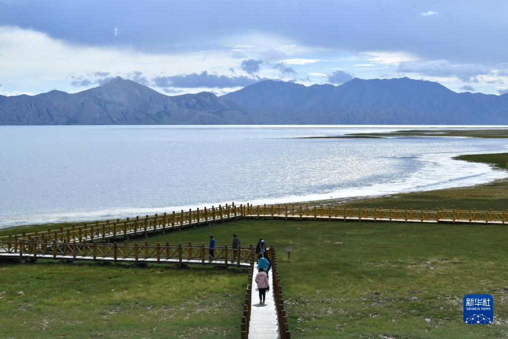 游客行走在青海省果洛藏族自治州瑪多縣冬格措納湖岸畔的木棧道上(2022年8月14日)。新華社發(卡婭梅朵 攝)
