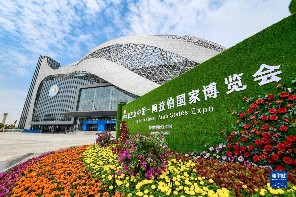 這是2021年8月18日拍攝的第五屆中國-阿拉伯國家博覽會開幕大會會址——寧夏國際會堂外景。新華社記者 馮開華 攝