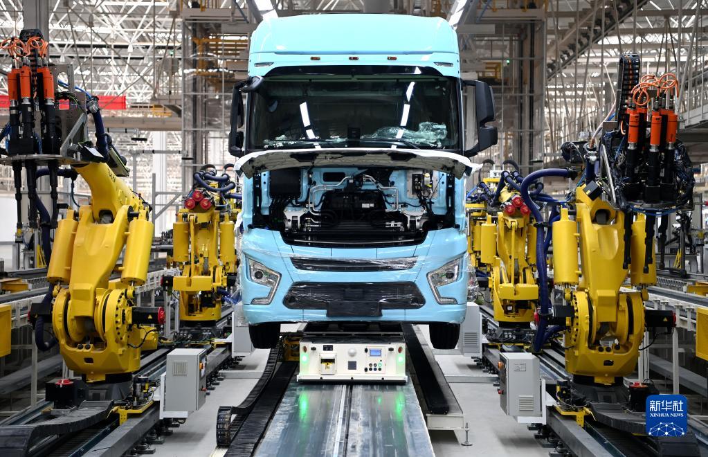 在陜汽重卡擴能項目現場,一輛重卡在汽車總裝生產線輪胎自動化裝配擰緊無人工作站進行裝配(2022年9月27日攝)。新華社記者 劉瀟 攝