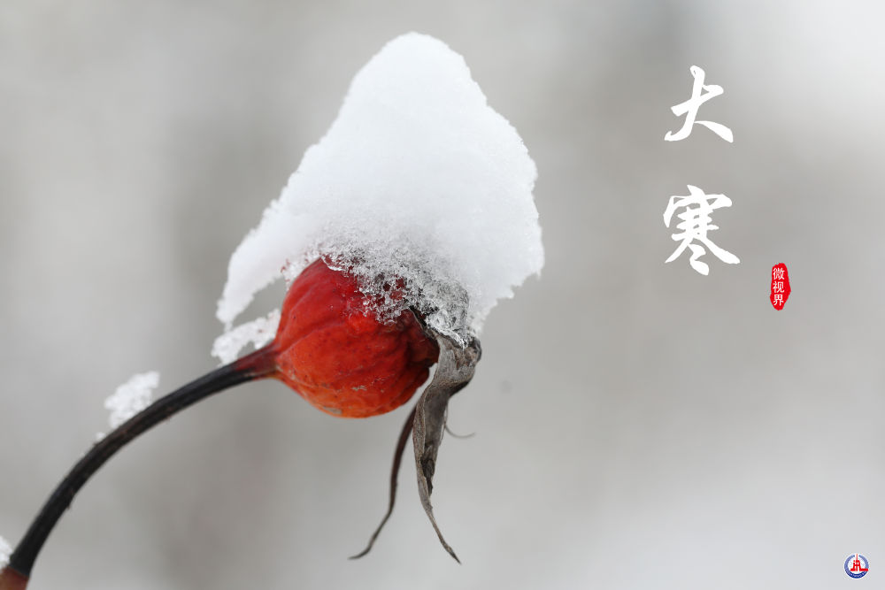 ↑河南省焦作市溫縣,月季花果實與白雪相映成趣。新華社發(徐宏星 攝)