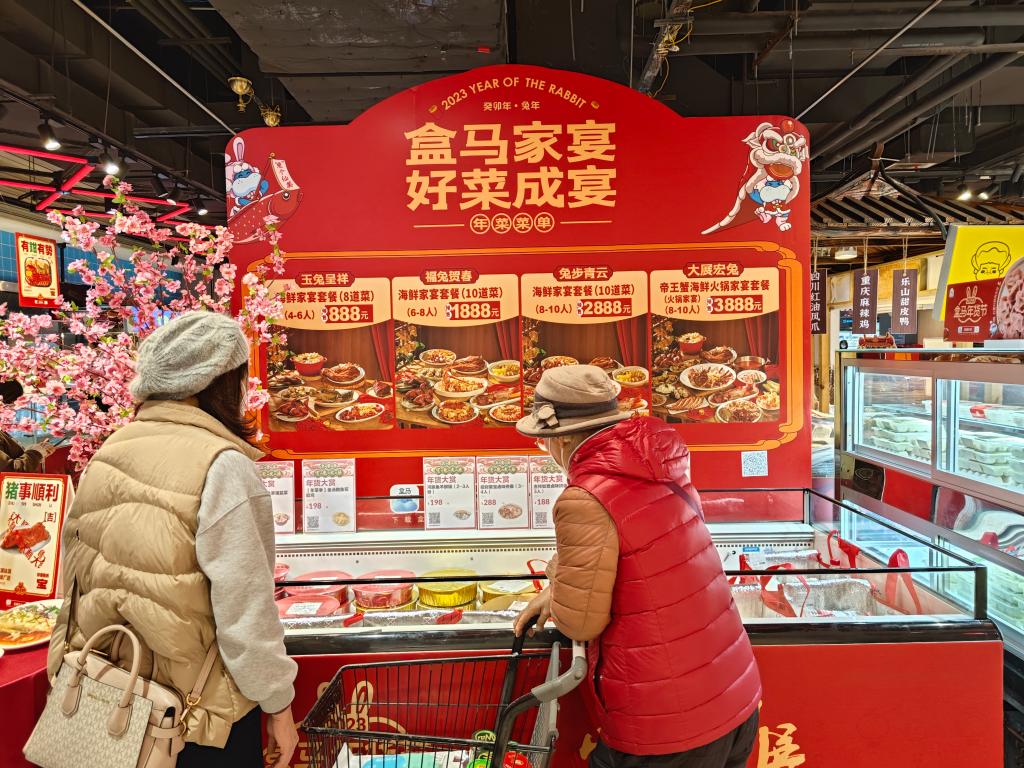 廣州盒馬鮮生門店,顧客在選購年夜飯套餐。新華社記者 胡林果 1月19日攝