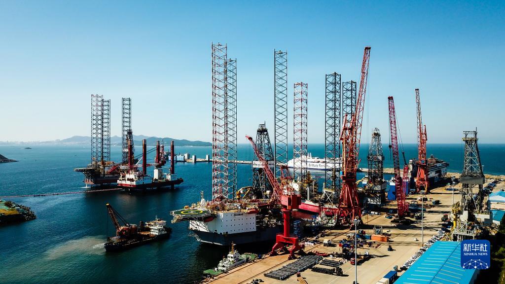 招商局金陵船舶(威海)有限公司造船泊位上忙碌生產的景象(2022年9月7日攝,無人機照片)。山東省威海經濟技術開發區目前已匯聚一批裝備項目,形成百億元海工裝備產業集群。新華社記者 郭緒雷 攝