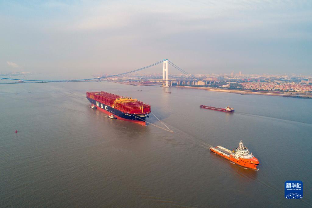 在海事部門海巡艇護航下,一次可裝載24346個標準集裝箱的集裝箱船“鑫福102”輪在江蘇泰興揚子鑫福船廠離泊進入長江拖航作業(2022年12月12日攝,無人機照片)。新華社發(湯德宏 攝)