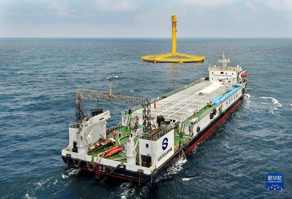 由江蘇啟東中遠海運海工為國外客戶訂制的N966自升式風電安裝船交付啟航(2022年12月20日攝,無人機照片)。新華社發(許叢軍 攝)