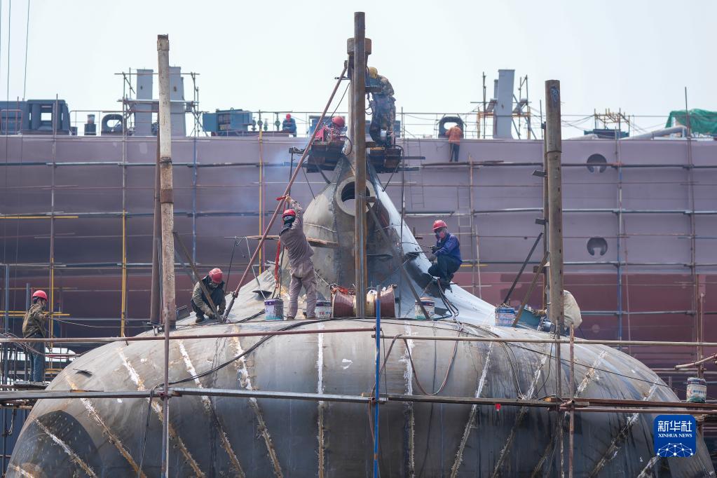 工程技術人員在位于山東省威海市的黃海造船有限公司廠區建造船舶(2022年5月20日攝)。新華社記者 朱崢 攝