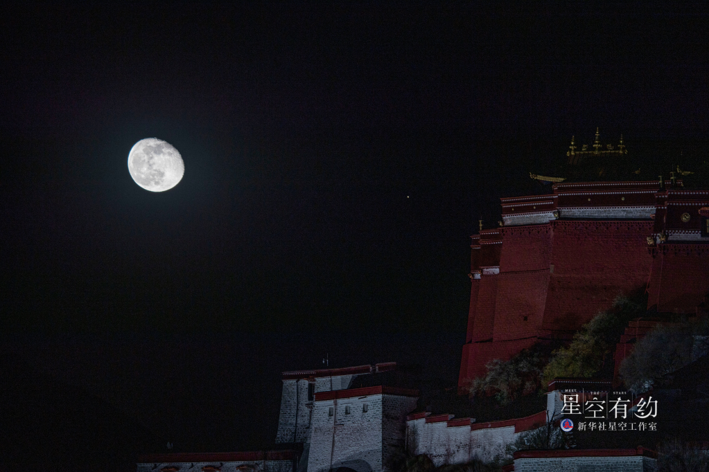2022年11月11日晚在拉薩布達拉宮附近拍攝的火星合月。新華社記者孫非 攝