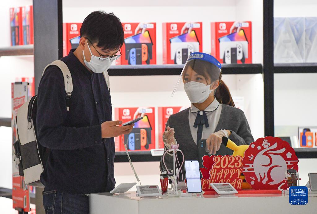 1月19日,消費者在中免集團??谌赵聫V場免稅店選購電子產品。新華社記者 蒲曉旭 攝