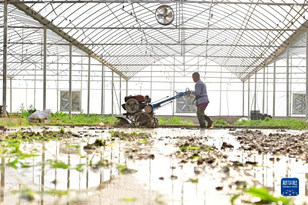 1月29日,在湖南省婁底市雙峰縣青樹坪鎮歸古新村,農民駕駛農機在大棚內整地。新華社發(李建新 攝)