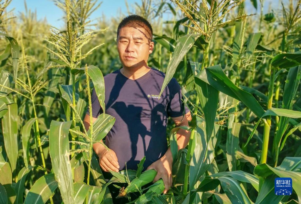 在吉林省梨樹縣北夏家村,聚豐種植農民專業合作社負責人邵亮亮檢查玉米長勢(資料照片)。新華社發