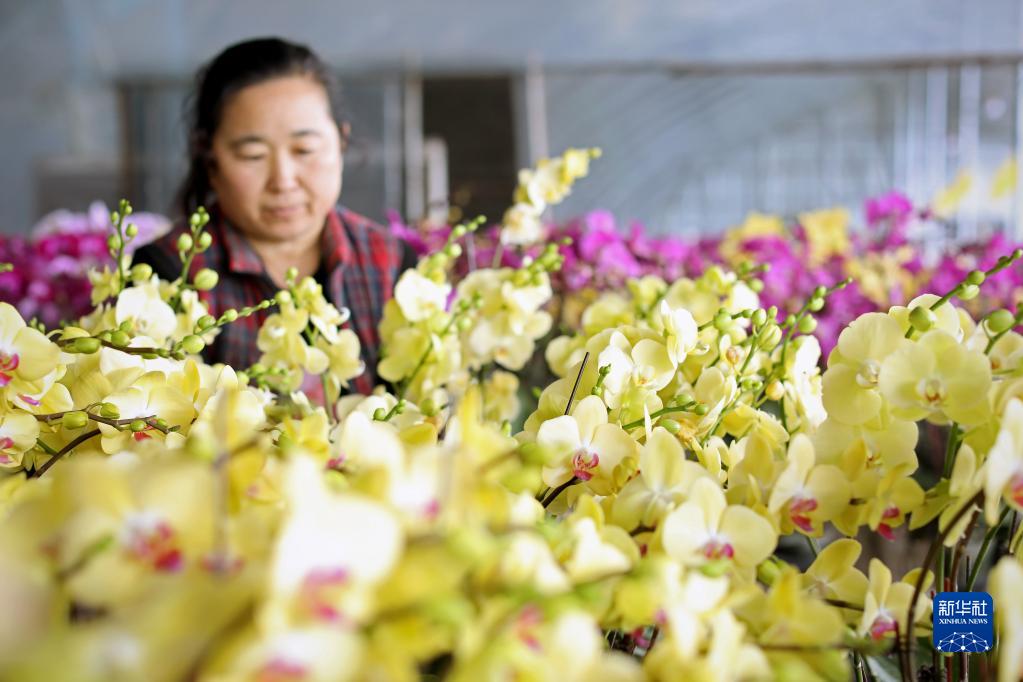 2月1日,遼寧省沈陽市十里河街道花卉基地一位花農在大棚內對蝴蝶蘭進行花間管理。新華社記者 姚劍鋒 攝