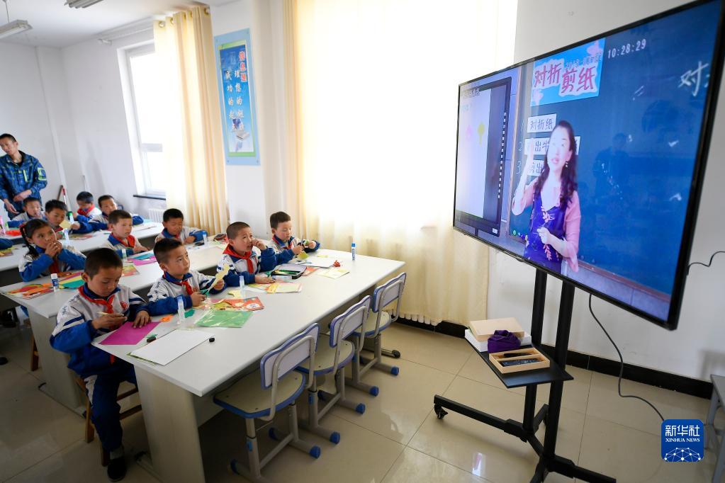 移民村的孩子在寧夏中衛市中寧縣寬口井中石油希望學?!霸诰€課堂”上課(2018年3月27日攝)。寧夏中衛市中寧縣寬口井中石油希望學校位于中寧縣寬口井生態移民村。自2015年開始,該學校與銀川市二十一小學結成幫扶對子,共同搭建了在線課堂。通過建立“智慧課堂”,讓移民學生和教師可以隨時觀摩到自治區多所重點中小學的課程。新華社記者 王鵬 攝