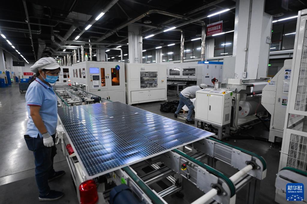 1月10日,在位于浙江嘉興秀洲光伏小鎮內的一家科技有限公司,工人在查看剛生產出來的光伏設備組件。新華社記者 徐昱 攝