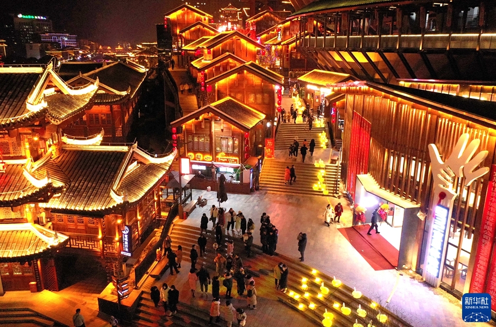 1月25日,湖北省宣恩縣興隆老街燈火輝煌(無人機照片)。新華社發(宋文 攝)