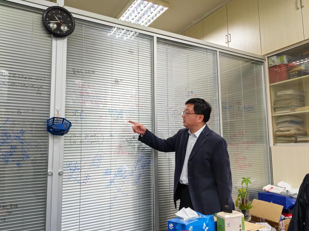 華東理工大學分析測試中心3樓,藍閩波的辦公室略顯雜亂:一個資料柜門前掛著長尾夾,夾著厚厚一疊座談、調研安排;書桌一旁的透明推拉門則被他當成了“白板”,上面用馬克筆寫滿了各種化學分子式和思考要點。