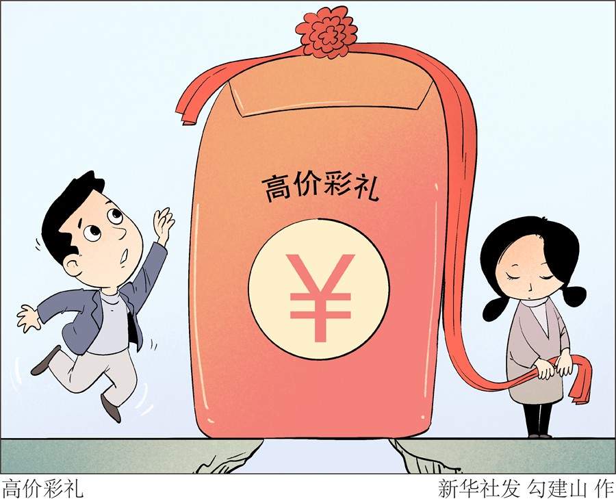 一些農村地區存在“條件越差彩禮越高、家里越難彩禮越高”的現象,個別家庭甚至“因婚致貧”。還有的家庭囿于重男輕女的落后觀念,將嫁女所得的彩禮用于給兒子娶媳婦,形成區域性彩禮金額越漲越高的惡性循環?,F實中,高價彩禮屢屢引發社會問題?;蜃屵m婚青年“談婚色變”,或讓本應喜結連理的男女情感破裂,甚至反目成仇直至引發刑事案件,上演“人財兩空”的悲劇。即使成婚,高價彩禮也埋下了矛盾隱患,加劇了雙方的不平等地位,進而影響到家庭關系和夫妻情感,讓尚未穩定的婚姻關系平添變數。