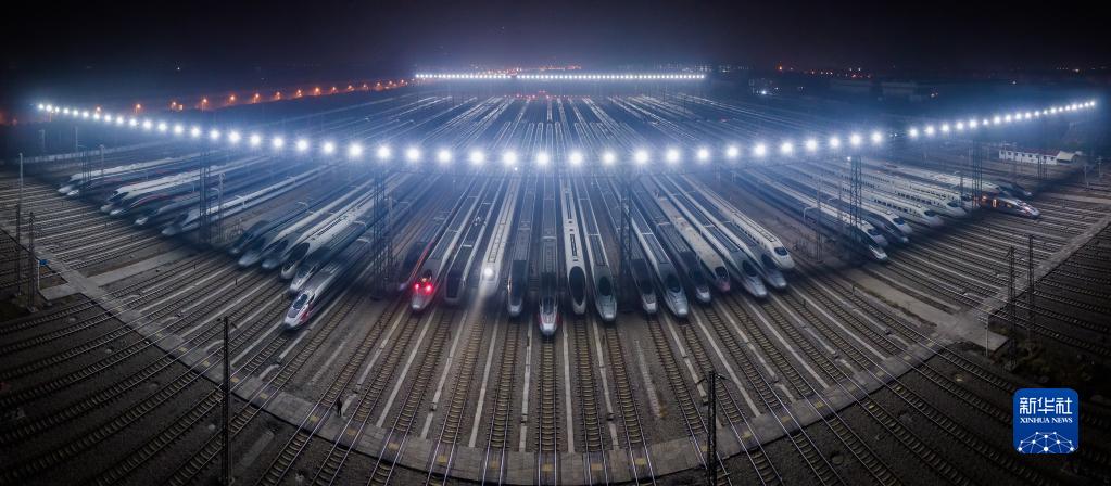 動車組列車??吭谖錆h動車段的存車線上(1月7日攝,無人機拼接照片)。新華社記者 伍志尊 攝