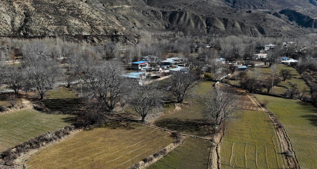 核桃樹環抱的山南市加查縣拉崗村(2月1日攝 無人機照片)。新華社記者晉美多吉 攝