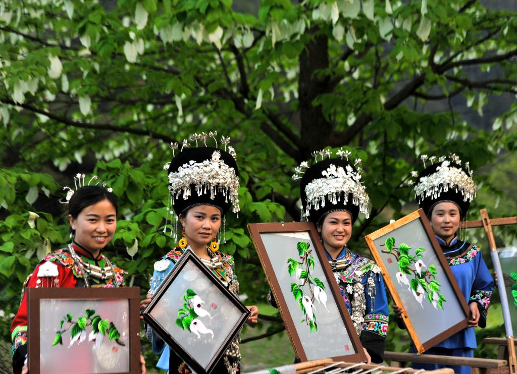 繡娘展示“鴿子花”系列苗繡產品。新華社發(龍元彬攝)