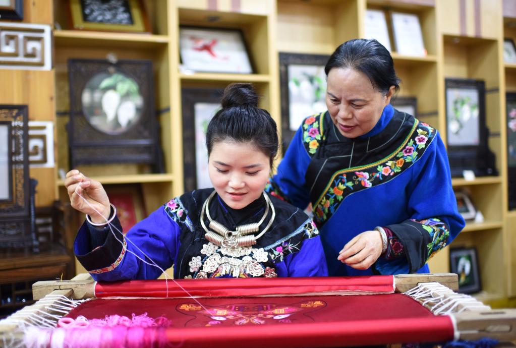 石麗平(右)在指導繡娘。新華社發(龍元彬攝)